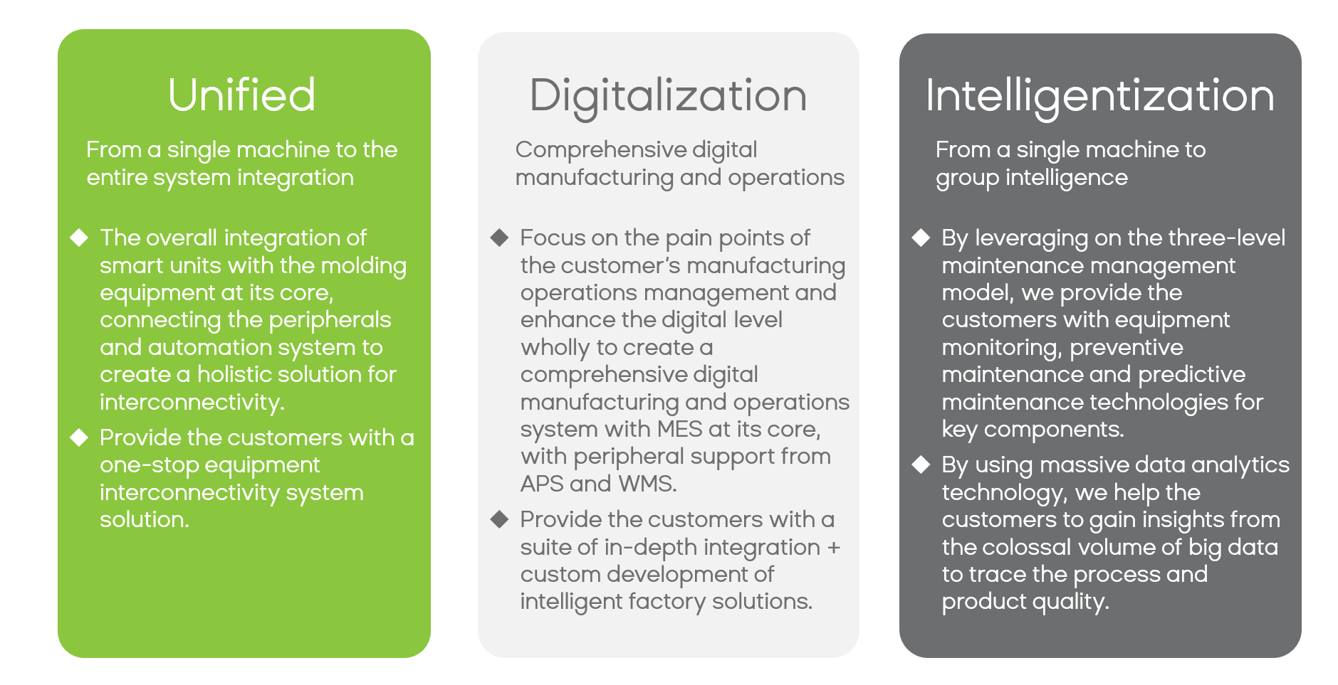 Yi+ intelligent manufacturing platform is used in the production process of the polymer material forming industry which integrates IoT, Cloud, Big Data and other new generation ICT technologies to solve the issues of equipment monitoring, efficiency statistics, equipment maintenance, troubleshooting, process parameter monitoring and traceability, etc., improving production efficiency and product + quality. Yi intelligent manufacturing platform currently includes two products: Yi MES (Manufacturing Execution System) and Yi CMS(Condition Monitor System).