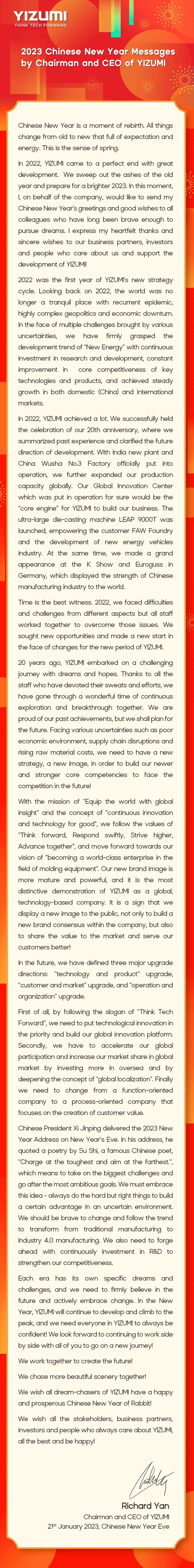 2023 Chinese New Year Messages by Chairman and CEO of YIZUMI
