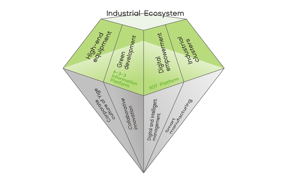 The model is based on the "6-3-3 Information Platform", which consists of 6 major operational platforms, 3 integrated platforms and 3 global infrastructure platforms and the "Molding Equipment IIOT Platform". It applies the principles of Porter Diamond Theory, integrating people, the ecological environment, and industrial in depth. It builds internal capabilities via YIZUMI Corporate Culture, Collaborative Innovation, Digital and Intelligent Management, and Smart Manufacturing driving for high-end equipment, green development, digital empowerment and industrial clusters. It aims to achieve symbiosis and interdependence in the industrial ecosystem along the entire value chain under the framework of digital intelligent operations.