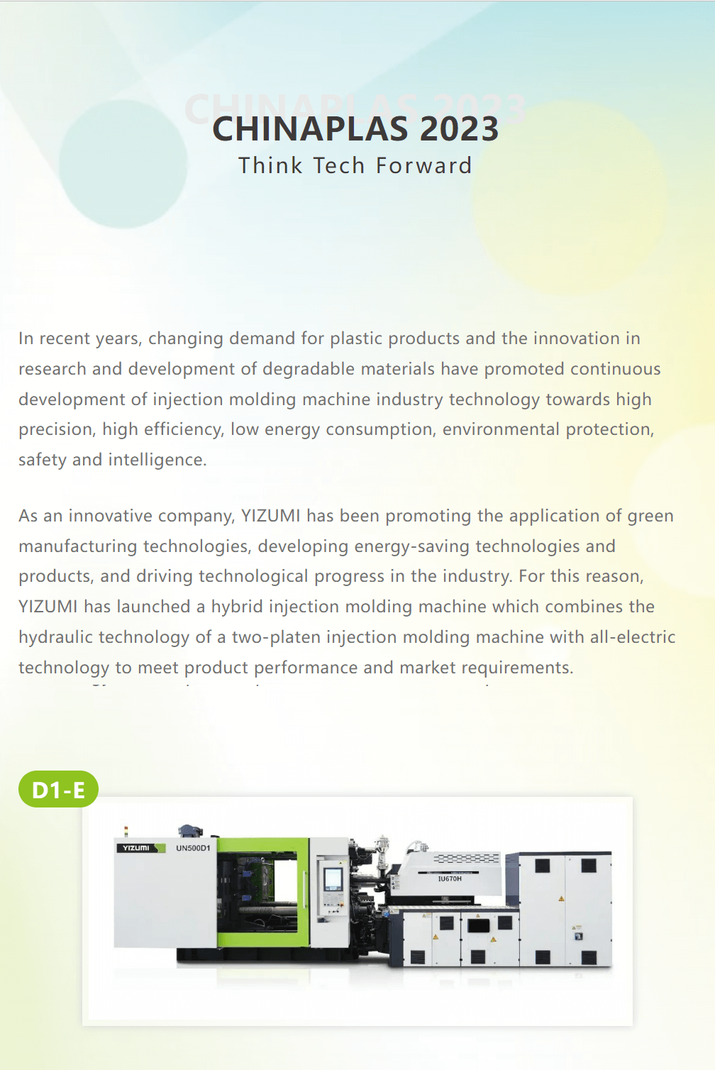 For the first time, YIZUMI will appear on the international stage, CHINAPLAS 2023, with the slogan "Think Tech Forward" to compete with top companies, but also expect to jointly promote the development and progress of the industry by linking global wisdom. Moreover, YIZUMI hopes to take this opportunity to establish closer cooperation with all customers and explore more business opportunities together.YIZUMI sincerely invites you to visit our booths from 17th to 20th April.