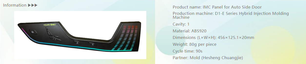 At CHINAPLAS 2023, our molding solution for IMC panels of auto side doors will be displayed by D1-E series hybrid injection molding machine. It is reported that this solution is a 3D side door panel decoration product for auto created by YIZUMI together with Shenzhen Hesheng Chuangjie Technology Co., Ltd. By using the In-Mold Circuit (IMC) technology, the product allows 3D touch control. Decorative patterns are printed on film sheets, conductive lines are printed on ink decorative layers, and then patterns and touch control circuits are made into a 3D intelligent touch panel through injection molding.