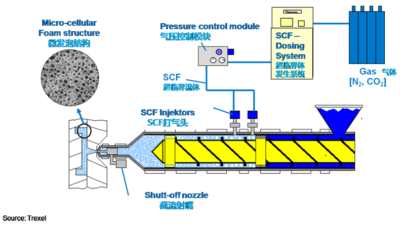 MuCell其實(shí)是物理發(fā)泡的過程,在塑化過程中注入超臨界流體到塑料熔體中,塑料熔體進(jìn)入模腔后,由于壓力的下降,超臨界流體發(fā)泡成核,泡孔持續(xù)長大,直到塑料熔體充滿模腔后由于膨脹能力限制或熔體冷卻才停止長大,最終在產(chǎn)品中形成非常細(xì)微的蜂巢狀結(jié)構(gòu)。