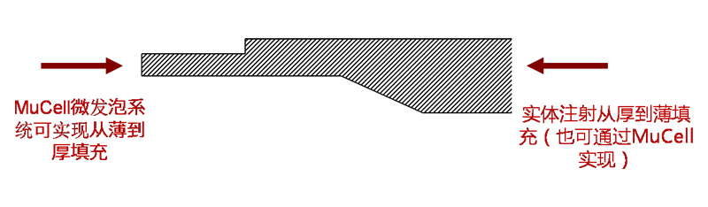 由于MuCell的超臨界流體SCF使塑料的流動(dòng)性變得更好,對制品的壁厚填充難度大大降低,從而為制品設(shè)計(jì)提供了更大的空間。而且可實(shí)現(xiàn)從薄壁至厚的壁填充,實(shí)現(xiàn)1:1的主壁與筋位結(jié)構(gòu),以及提高尺寸的穩(wěn)定性。