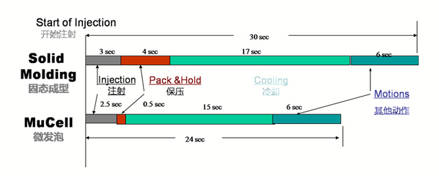 對比傳統(tǒng)注塑成型技術(shù),由于無需保壓,MuCell一般可以縮短15%-30%成型時(shí)間。