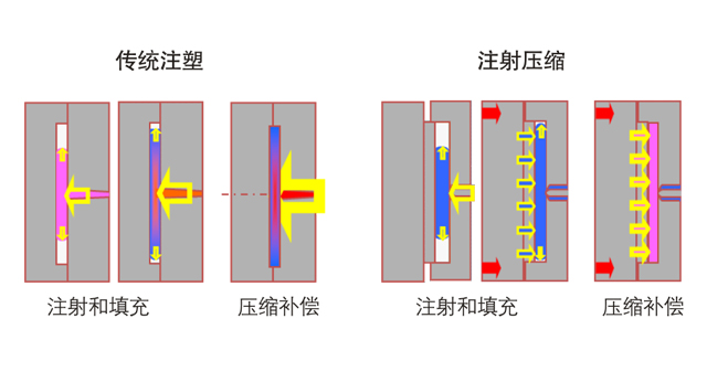 注射壓縮成型是傳統(tǒng)注塑成型的高級形式,結合了射出成型和壓出成型兩種技術。在填充階段,當模具未完全閉合時,塑料注入模腔,鎖模單元開始運轉(zhuǎn)直到模具完全閉合,通過動模板壓縮動作的一個反作用力讓熔膠進入模腔,完成填充。傳統(tǒng)注塑與注射壓縮成型,如圖1所示。