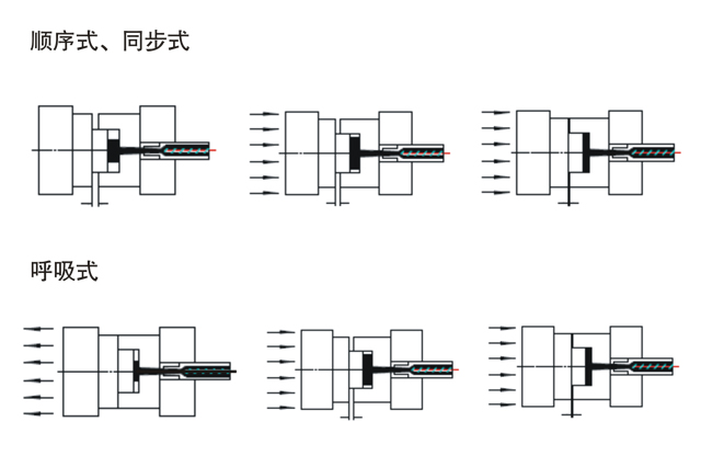 主要用于大面積薄壁汽配零件,零件必須是中心澆口,中心對稱或接近中心對稱的。DP系列注塑機提供標準軟件包,這一功能適用于所有的DP系列注塑機,盡管這樣,推薦客戶注射部分標配采用蓄能器伺服注射系統(tǒng)。根據(jù)不同的產(chǎn)品需求,基本型又可分為順序(SEQ-ICM)式,同步式(SIM-ICM),呼吸式(BREATH-ICM),局部加壓式(SELECT-/COM-ICM)四種工藝過程,如圖2所示。順序式為先注后壓;同步式為注壓同步;呼吸式為先合模,開模和注射同步,到位的再壓;局部加壓式為合模后,注射,然后在注射時或注完后,型腔的某個局部位置壓向模腔,使之受壓變薄,達到良好的充模效果。