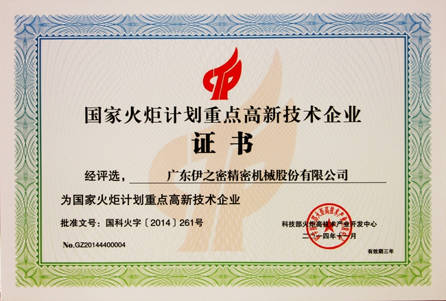 據(jù)悉,國(guó)家火炬計(jì)劃重點(diǎn)高新技術(shù)企業(yè)認(rèn)定由科技部組織實(shí)施,是一項(xiàng)發(fā)展我國(guó)高新技術(shù)產(chǎn)業(yè)的指導(dǎo)性計(jì)劃,旨在促進(jìn)高新技術(shù)成果的商品化、產(chǎn)業(yè)化和國(guó)際化。其中,火炬計(jì)劃重點(diǎn)高新技術(shù)企業(yè)的評(píng)選為三年一次,要求被認(rèn)定企業(yè)要具備較強(qiáng)的研究開(kāi)發(fā)能力和技術(shù)創(chuàng)新能力外,還要求企業(yè)主導(dǎo)產(chǎn)品的技術(shù)水平在國(guó)內(nèi)處于領(lǐng)先地位,同時(shí)企業(yè)的高新技術(shù)產(chǎn)品銷(xiāo)售收入至少要占據(jù)企業(yè)年銷(xiāo)售收入的60%。行業(yè)專家表示,國(guó)家火炬計(jì)劃重點(diǎn)高新技術(shù)企業(yè)資格經(jīng)常成為政府采購(gòu)、重大商業(yè)項(xiàng)目采購(gòu)招標(biāo)等項(xiàng)目的準(zhǔn)入門(mén)檻,伊之密獲評(píng)“國(guó)家火炬計(jì)劃重點(diǎn)高新技術(shù)企業(yè)”,這是公司實(shí)力的有力明證。