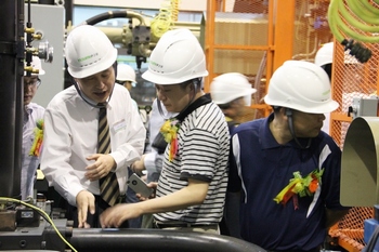 上午11:30,參加會(huì)議的代表參觀壓鑄機(jī)生產(chǎn)線現(xiàn)場(chǎng)。車(chē)間里,現(xiàn)場(chǎng)整齊整潔,生產(chǎn)井然有序,員工們?cè)诰o張的工作著。據(jù)壓鑄機(jī)事業(yè)部副總經(jīng)理黎前虎介紹,“今年的市場(chǎng)較好,客戶(hù)的需求量大,車(chē)間里已裝配完成的正在調(diào)試的絕大多數(shù)機(jī)器都是有訂單的,調(diào)試完畢后準(zhǔn)備出廠?!?br>     當(dāng)人們來(lái)到大機(jī)總裝現(xiàn)場(chǎng),其景觀更加令人振奮:兩臺(tái)出口加拿大的HPM2000T重型壓鑄機(jī)、伊之密2500T和其它不同噸位的重型冷室壓鑄機(jī)均在調(diào)試中。黎副總說(shuō),HPM重型壓鑄機(jī)近期的訂單都是北美的客戶(hù)。伊之密將在2014年根據(jù)國(guó)內(nèi)市場(chǎng)的需求,在中國(guó)大陸推出HPM重型壓鑄機(jī)系列,滿(mǎn)足國(guó)內(nèi)客戶(hù)的需求。