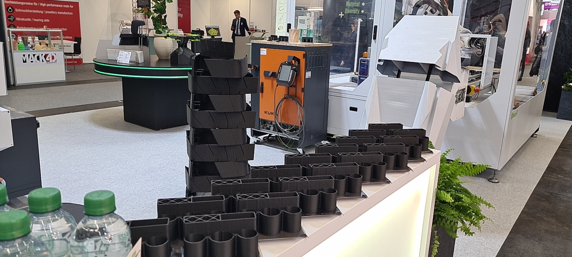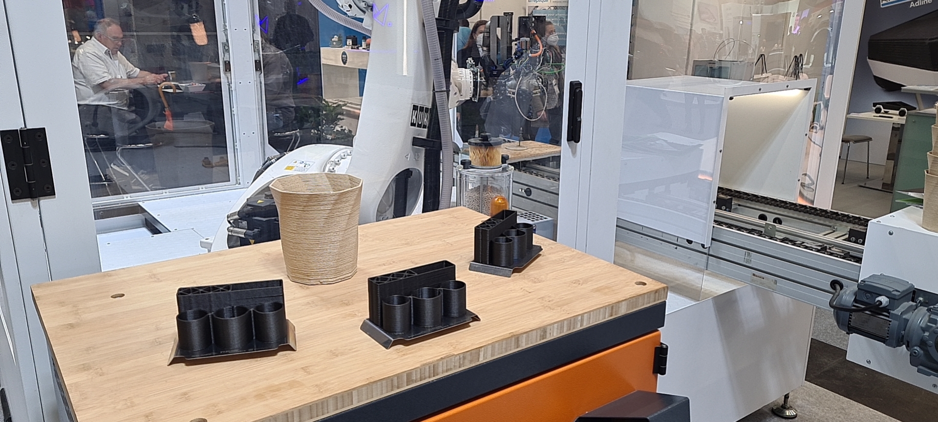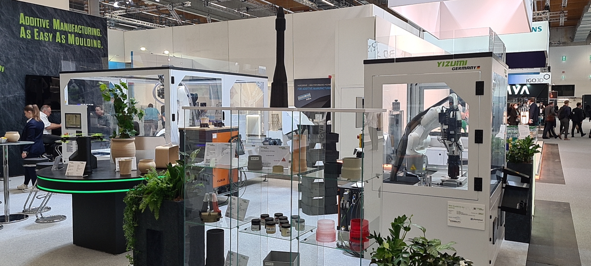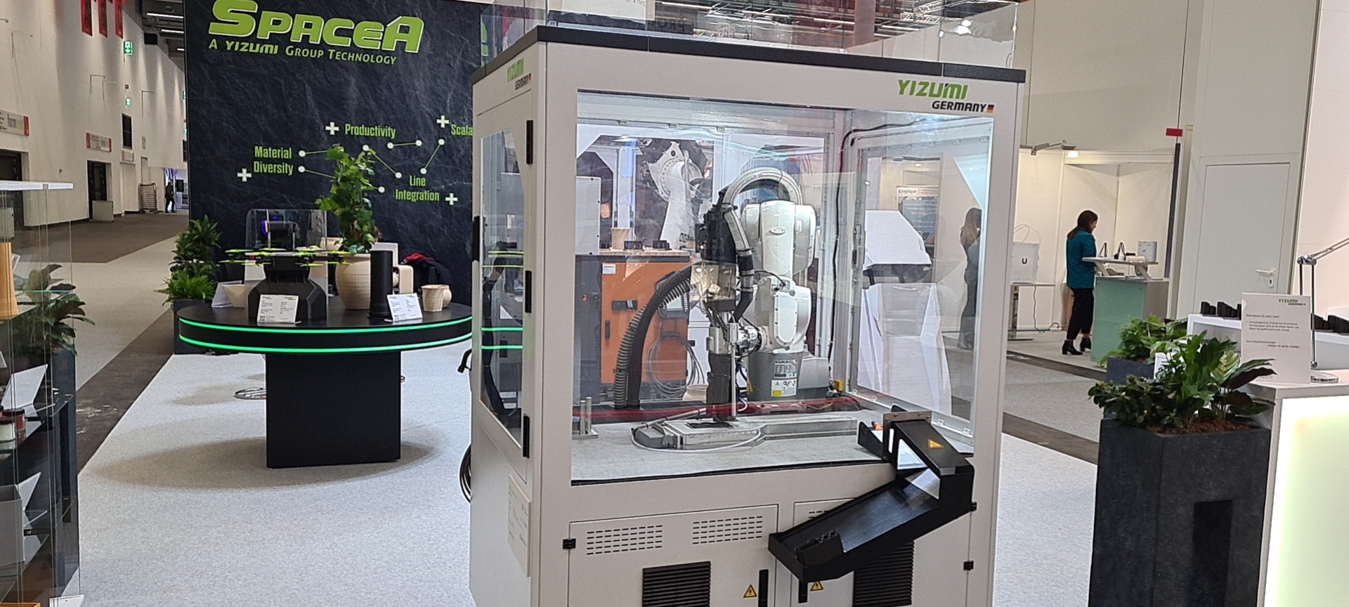 展會(huì)上,德國伊之密不僅擺出了款式多樣的3D打印制品,還展示了SpaceA工業(yè)3D打印機(jī)領(lǐng)域的創(chuàng)新成果。大型SpaceA-2000-500-2H和小型SpaceA-900E-500-S分別在現(xiàn)場打印生物基花瓶和筆筒,吸引了大量關(guān)注尖端科技的人群目光。