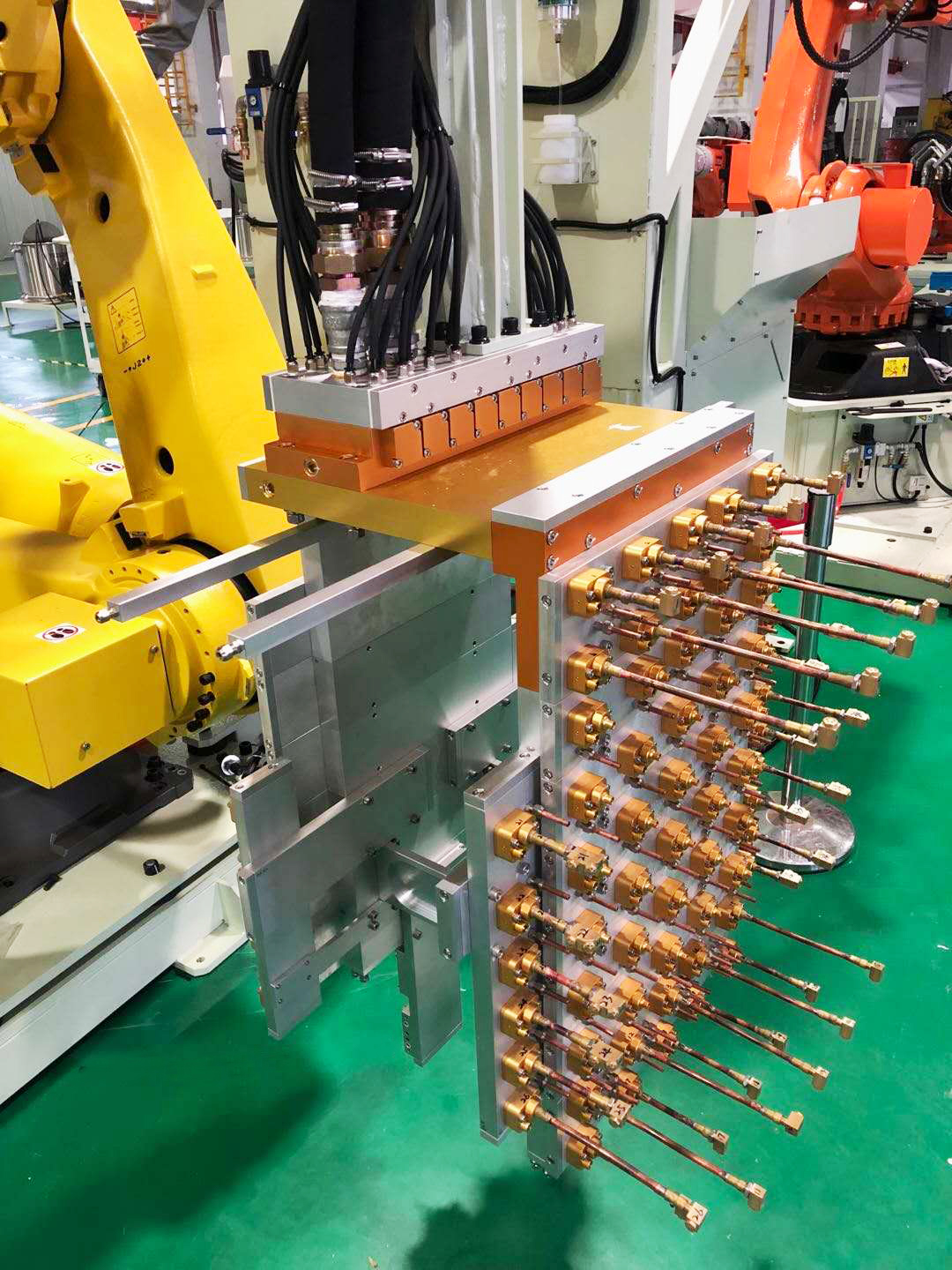伊之密針對產品中殼模具設計的專用仿型噴涂手,采用組合式結構設計,可在噴涂時減少多余動作,適量拓展組合,增加噴頭數(shù)量,噴涂有效距離可達500mm以上??刂崎y與噴涂手的連接,保證了霧化氣和吹氣流量,響應快,有效提高噴涂頻率和質量,優(yōu)良的霧化效果使脫模劑均勻覆蓋模具表面,故障率低。