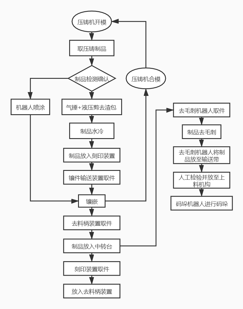 整套系統(tǒng)可實現(xiàn)模具的離型劑噴涂及產品從壓鑄機中取出、完整性檢測、去渣包、冷卻、打磨去毛刺、碼垛等流程的全自動化生產。