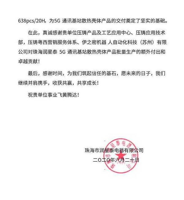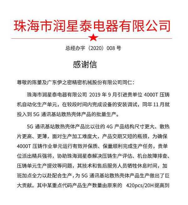 基于伊之密設(shè)備和團(tuán)隊(duì)的出色表現(xiàn),今年6月20日,潤(rùn)星泰公司向伊之密發(fā)來(lái)感謝信,信中表示:“面對(duì)生產(chǎn)加工難度大,產(chǎn)品交期又短的瓶頸,為確保4000T壓鑄作業(yè)單元運(yùn)行有效并保質(zhì)、保量順利完成生產(chǎn)任務(wù),貴單位派出精兵強(qiáng)將,協(xié)助珠海潤(rùn)星泰解決壓鑄生產(chǎn)評(píng)估、機(jī)臺(tái)故障排查、壓鑄單元生產(chǎn)提效等問(wèn)題,其技術(shù)和售后服務(wù)人員犧牲休息時(shí)間,加班加點(diǎn)全力以赴配合生產(chǎn),為5G通訊基站散熱殼體產(chǎn)品生產(chǎn)做出了巨大貢獻(xiàn)?!薄捌渲心持攸c(diǎn)代碼產(chǎn)品生產(chǎn)數(shù)量由原來(lái)的420pcs/20H提高到638pcs/20H,為5G通訊基站散熱殼體產(chǎn)品的交付奠定了堅(jiān)實(shí)的基礎(chǔ)。”
