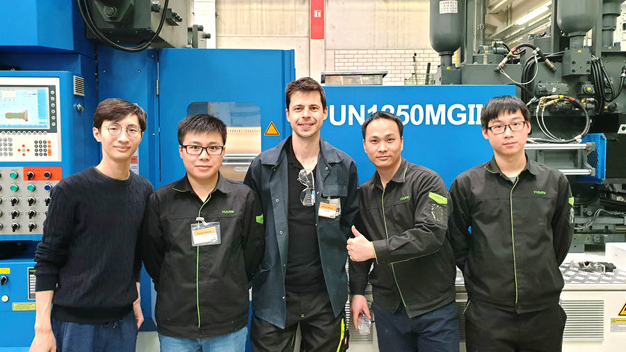 Philipp Ochotta與中國半固態(tài)鎂合金注射成型團(tuán)隊(duì)成員(背景為伊之密UN1250MGII半固態(tài)鎂合金注射成型機(jī))