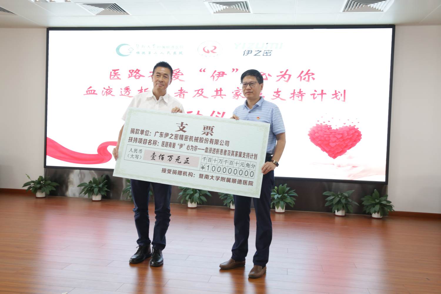 在啟動(dòng)儀式上,伊之密公司董事長陳敬財(cái)向暨南大學(xué)附屬順德醫(yī)院黨委副書記、院長陳玉兵移交捐贈(zèng)支票,伊之密捐資的100萬元將定向用于“醫(yī)路有愛'伊’心為你”---血液透析患者及其家屬支持計(jì)劃。