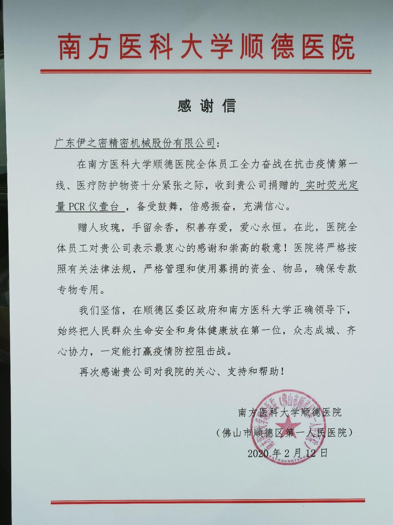 對于此次伊之密捐贈價(jià)值50萬元的實(shí)時熒光定量PCR儀,院方表示非常感謝:“在南方醫(yī)科大學(xué)順德醫(yī)院全體員工全力奮戰(zhàn)在抗擊疫情第一線、醫(yī)療防護(hù)物資十分緊缺之際,收到貴公司捐贈的設(shè)備,備受鼓舞,倍感振奮,充滿信心 ?!?/p>
