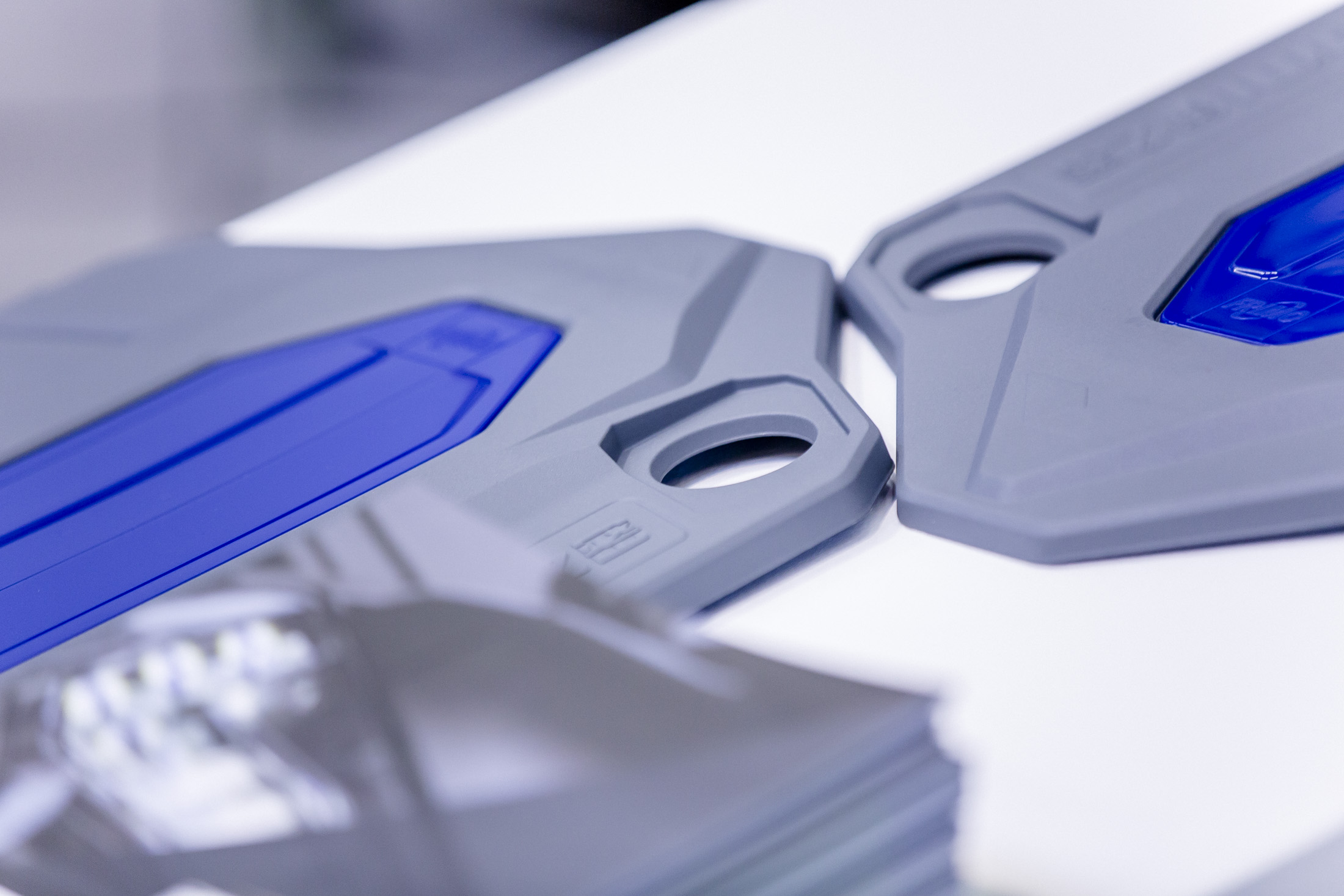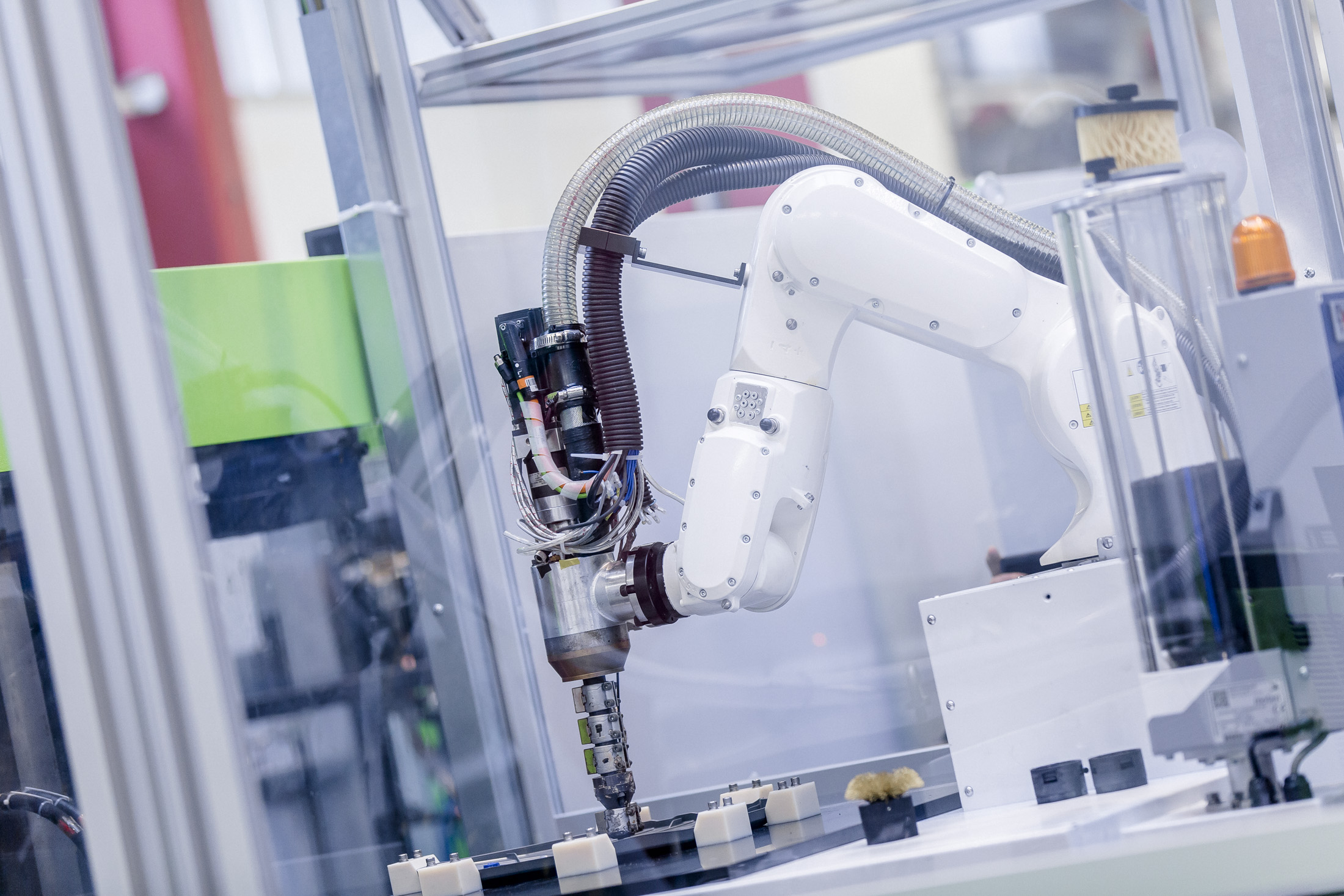經(jīng)過不同配方的測試后,伊之密最終選擇了Akro-Plastic的20%玻璃纖維增強聚酰胺Akromid B3 GF20 2 RM-DNaturl(4164)。在PUR方面,使用了來自Rühl的Puroclear。Rühl Puromer董事總經(jīng)理Ingo Kleba博士向來訪Frimo技術(shù)開放日的參觀者介紹了當(dāng)今使用PUR的生產(chǎn):“當(dāng)前的一個令人關(guān)注的話題是通過在零件上噴涂聚氨酯材料來對零件進行表面處理,既可以做成透明效果,也可以做成彩色的效果;此外,箔片幾乎可以無限變化的設(shè)計以及功能和光的結(jié)合,光澤度,日常使用的適用性和表面的耐刮擦性越來越好?!彼忉屨f,“PUR包覆工藝效率的決定性因素,尤其是與注塑成型工藝結(jié)合使用時,是現(xiàn)代Puroclear系統(tǒng)出色的自分離性,這使得無需使用其他常見的外部脫模劑或特殊的模具涂料,”他繼續(xù)說道。他尤其為具有自修復(fù)特性的PUR配方感到驕傲:“如果制品表面出現(xiàn)劃痕,在室溫下數(shù)小時內(nèi)就會消失。”
