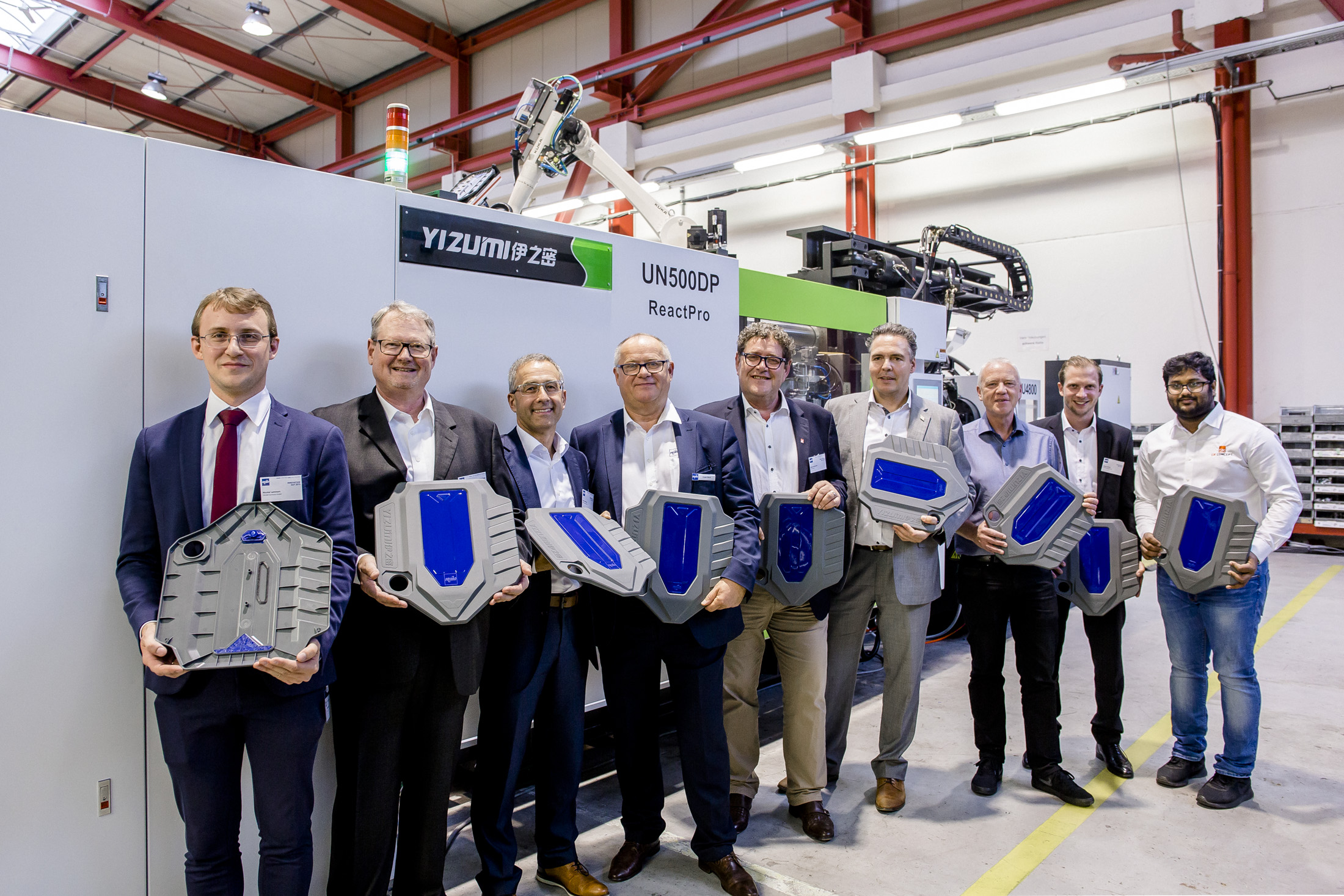 在不久前舉辦的Frimo技術(shù)開放日上 (Frimo Innovation Day),伊之密展示了如何將注塑成型與聚氨酯包覆成型的工藝巧妙地結(jié)合在一起。伊之密與合作伙伴Frimo提供的ReactPro方案,將注射成型與聚氨酯(PUR)包覆工藝結(jié)合在一起,更簡單、更模塊化、更靈活、更具成本效益。在Frimo總部舉行的聯(lián)合技術(shù)開放日上,第一套高度集成和自動化的ReactPro系統(tǒng)亮相,現(xiàn)場生產(chǎn)帶聚氨酯表面的發(fā)動機蓋,吸引了不少感興趣的專業(yè)觀眾。