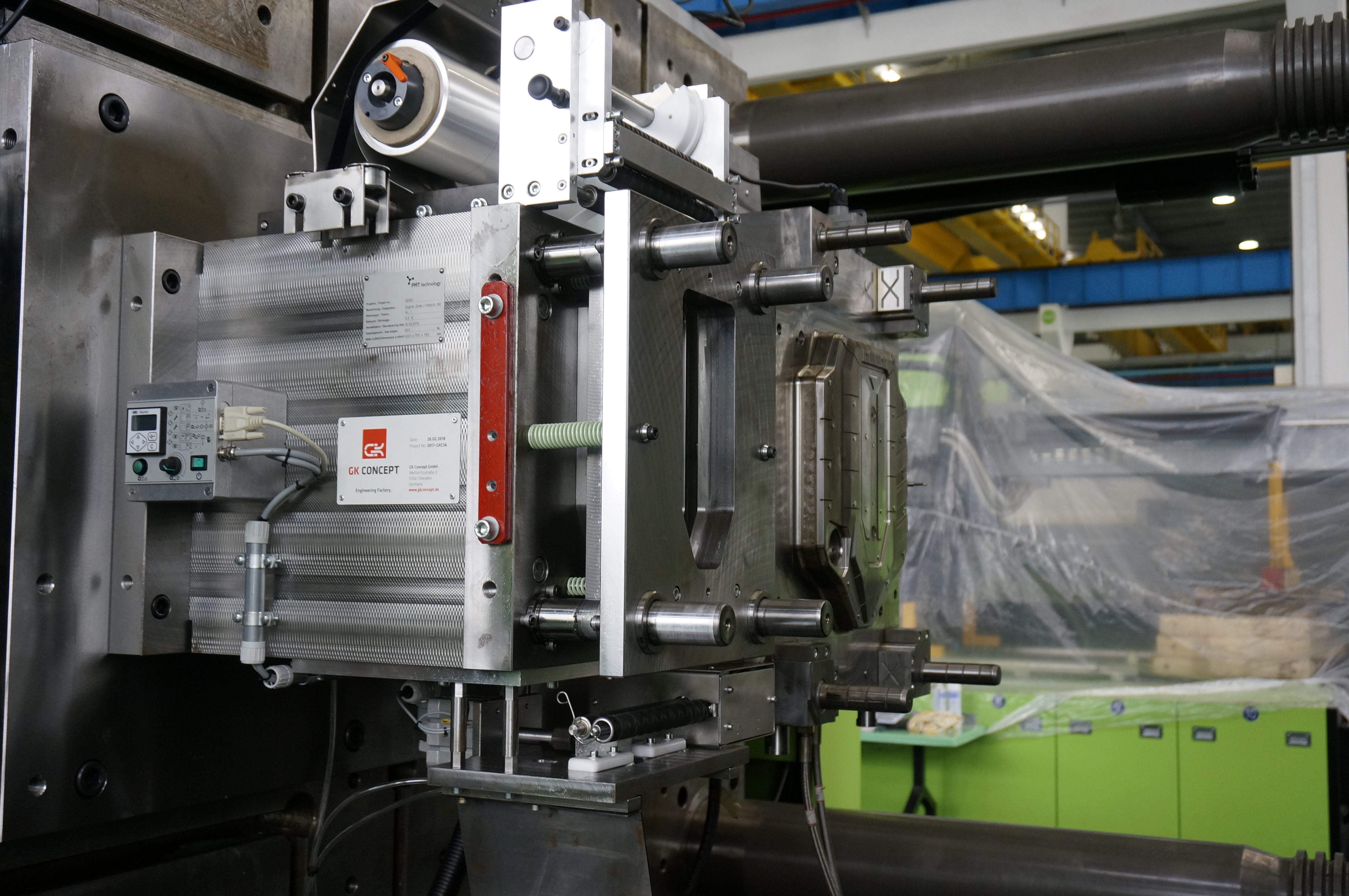 之后,聚合物熔體經(jīng)背注射進(jìn)入模腔,熔體充滿模腔同時(shí),注射壓力使得裝飾箔壓出與模腔表面一致的顆粒紋。方案中原料是PA66+30%GF,這是一種廣泛應(yīng)用于微發(fā)泡領(lǐng)域的材料。該材料是由AKRO-PLASTIC公司提供。