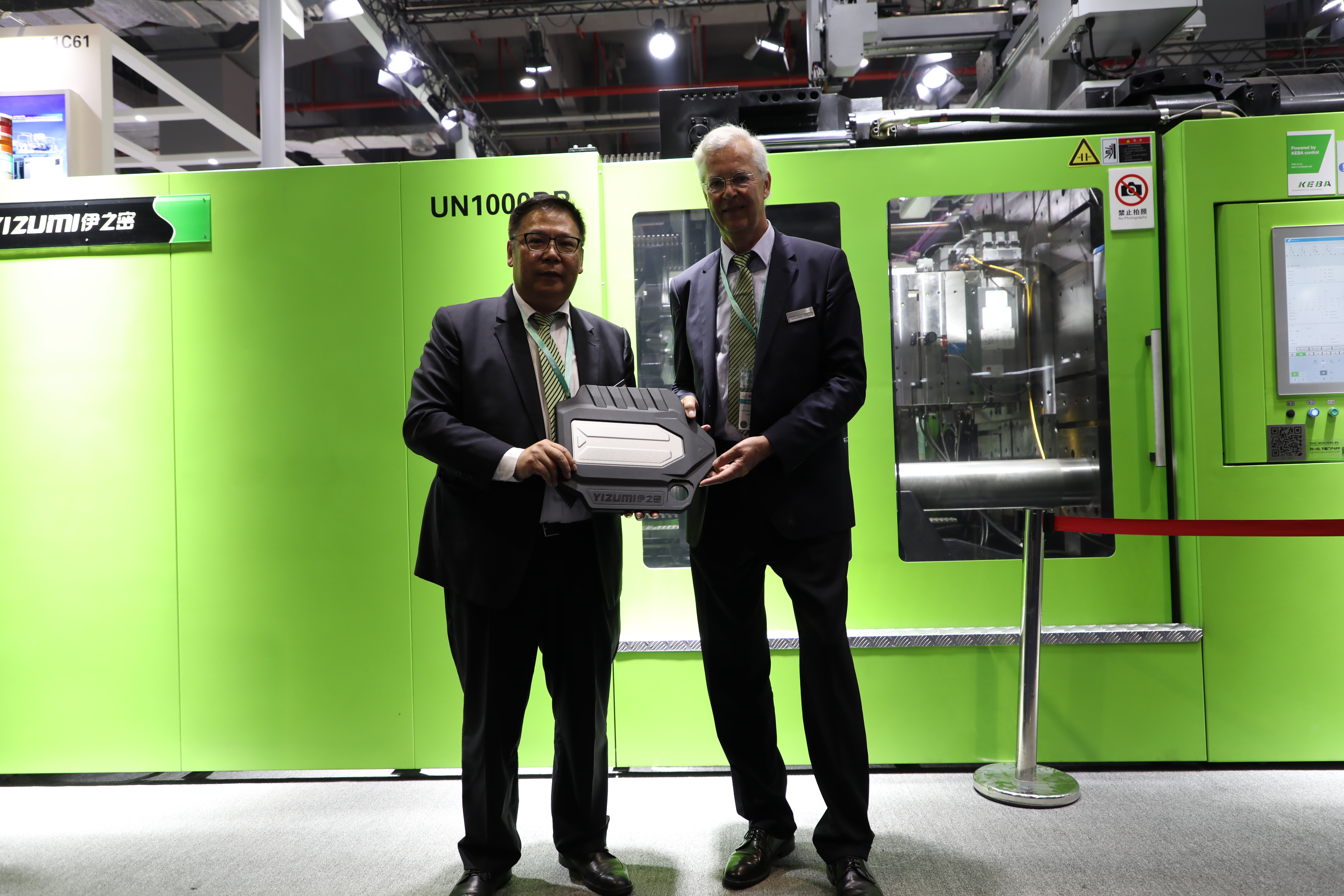 伊之密CEO甄榮輝先生和首席戰(zhàn)略官Dr.Hans Wobbe在2018 ChinaPlas給客戶展示發(fā)動(dòng)機(jī)蓋方案