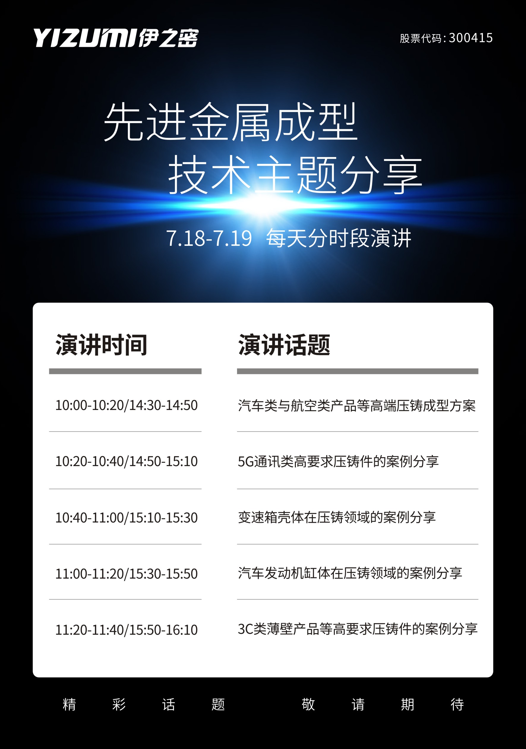 新能源汽車(chē)、5G通訊等前沿科技發(fā)展勢(shì)不可擋,壓鑄行業(yè)的升級(jí)和創(chuàng)新路在何方?7月18-19日,伊之密展臺(tái)現(xiàn)場(chǎng)將從上午10點(diǎn)開(kāi)始,全天十個(gè)時(shí)段,呈獻(xiàn)五大先進(jìn)金屬成型技術(shù)主題演講。