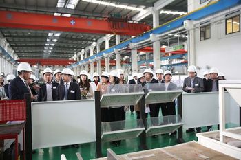 伊之密董事總經(jīng)理甄榮輝(左二)陪同媒體伊之密董事總經(jīng)理甄榮輝(右二)陪同媒體朋友參觀注塑機(jī)車間