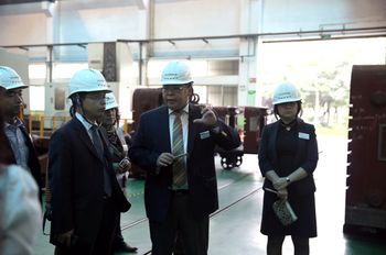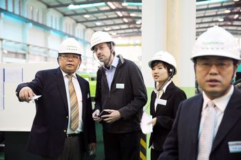 伊之密董事總經(jīng)理甄榮輝(左二)陪同媒體朋友們參觀壓鑄機(jī)車間   伊之密董事總經(jīng)理甄榮輝(左二)陪同媒體朋友們參觀橡膠注射機(jī)車間