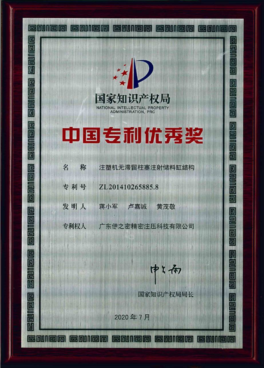 據(jù)統(tǒng)計,2020年伊之密申請專利83項,其中發(fā)明專利28項;獲得授權(quán)專利41項。其中“注塑機無滯留柱塞注射儲料缸結(jié)構(gòu)”獲中國專利優(yōu)秀獎。這是伊之密繼半固態(tài)鎂合金注射成型技術(shù)獲得第19屆中國專利優(yōu)秀獎后,2020年在第21屆中國專利獎再獲該項專利榮譽。伊之密專利名錄再添一張“國家級名片”!