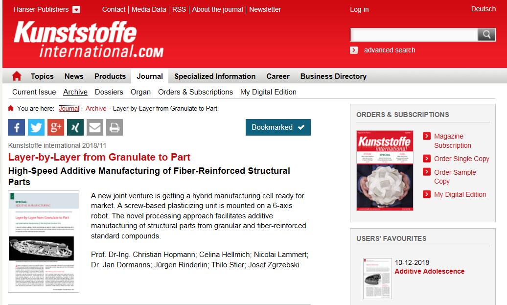 在英文雜志Kunststoffe international的11月刊上,伊之密機(jī)器人柔性增材制造系統(tǒng) SPACE A也上了頭條—— “德國伊之密正在準(zhǔn)備向市場推出一種將螺桿式塑化裝置固定在六軸機(jī)器人上的混合式制造單元。這一新式的加工方法實(shí)現(xiàn)了用顆粒和標(biāo)準(zhǔn)纖維增強(qiáng)混合物進(jìn)行結(jié)構(gòu)件的增材制造。”