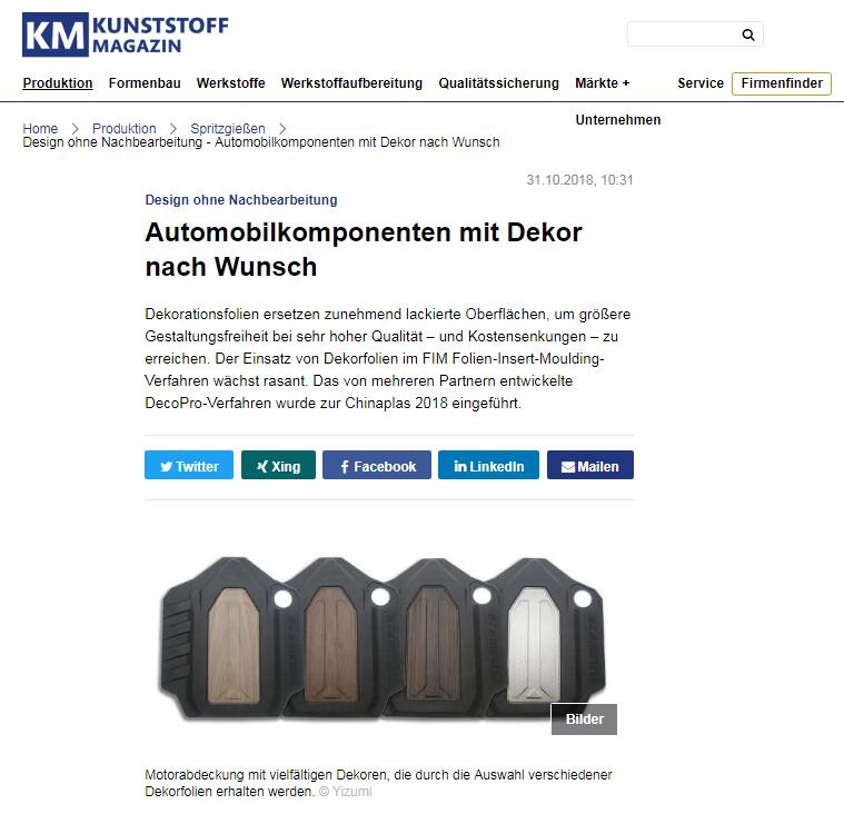 Kunststoffe Magazin 是世界著名的塑料行業(yè)媒體品牌,德國排名前二的塑料行業(yè)雜志,在德語國家發(fā)行量位居第一(IVW認(rèn)證)。此次Kunststoffe Magazin 2018年11-12雙月刊,介紹了伊之密FoamPro+DecoPro(微發(fā)泡+模內(nèi)裝飾)解決方案。該方案由伊之密與合作伙伴聯(lián)合開發(fā),在2018年Chinaplas上成功展示汽車發(fā)動(dòng)機(jī)蓋成型,獲得市場良好回應(yīng)。
