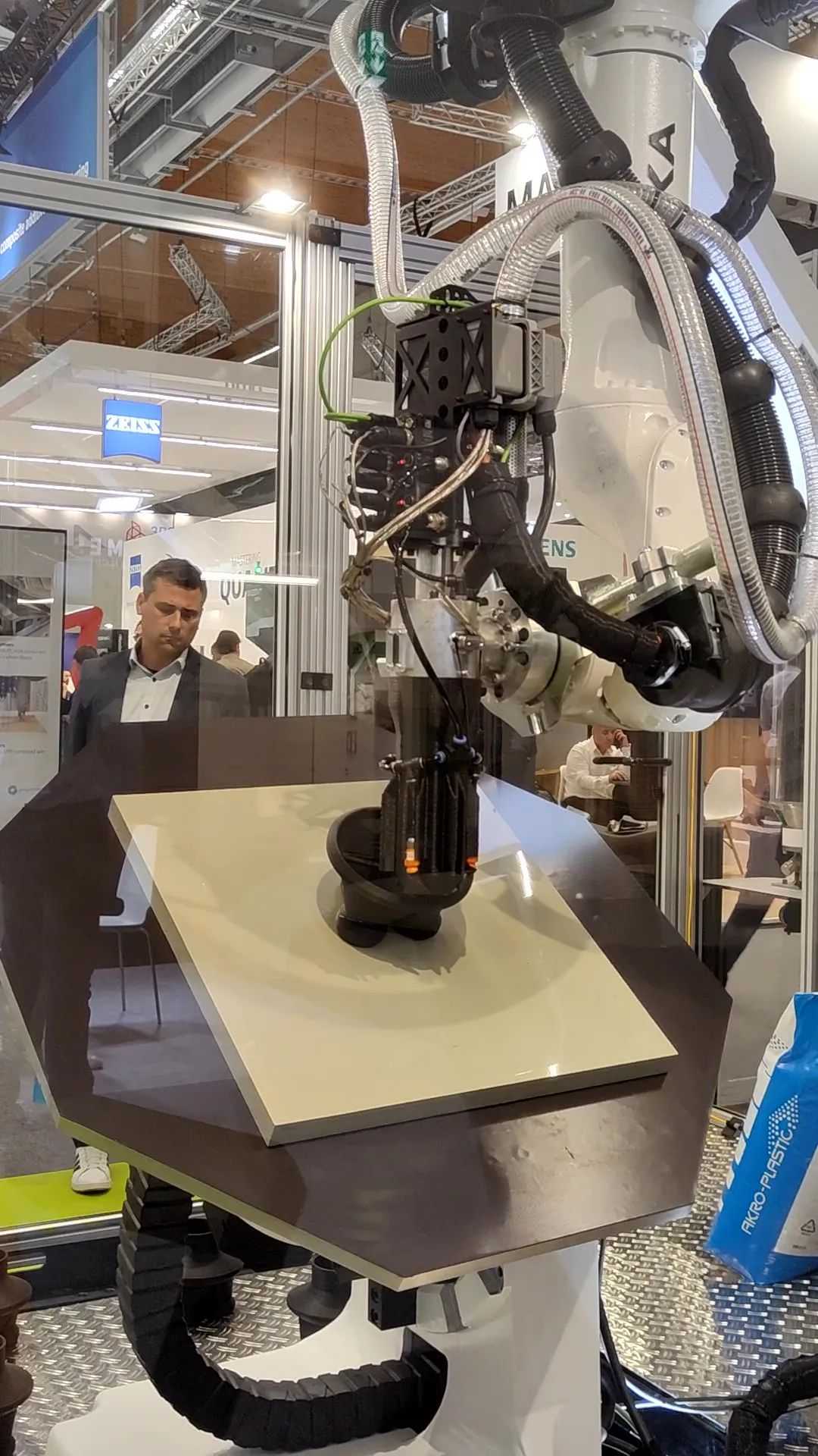在本次參展的SpaceA C-Line定制系列展機中,其核心設備是一臺2500 KUKA機器人,其構建平臺上額外增加了兩軸,使其能夠實現更靈活的平臺轉動和傾斜。這種獨特的設計不僅允許更為復雜的組件設計,還能夠滿足按需生產的需求,同時還能節(jié)省材料。與此同時, SpaceA C-Line系列提供了廣泛的解決方案,為客戶提供了多樣化的選擇,以滿足不同行業(yè)和項目的需求。