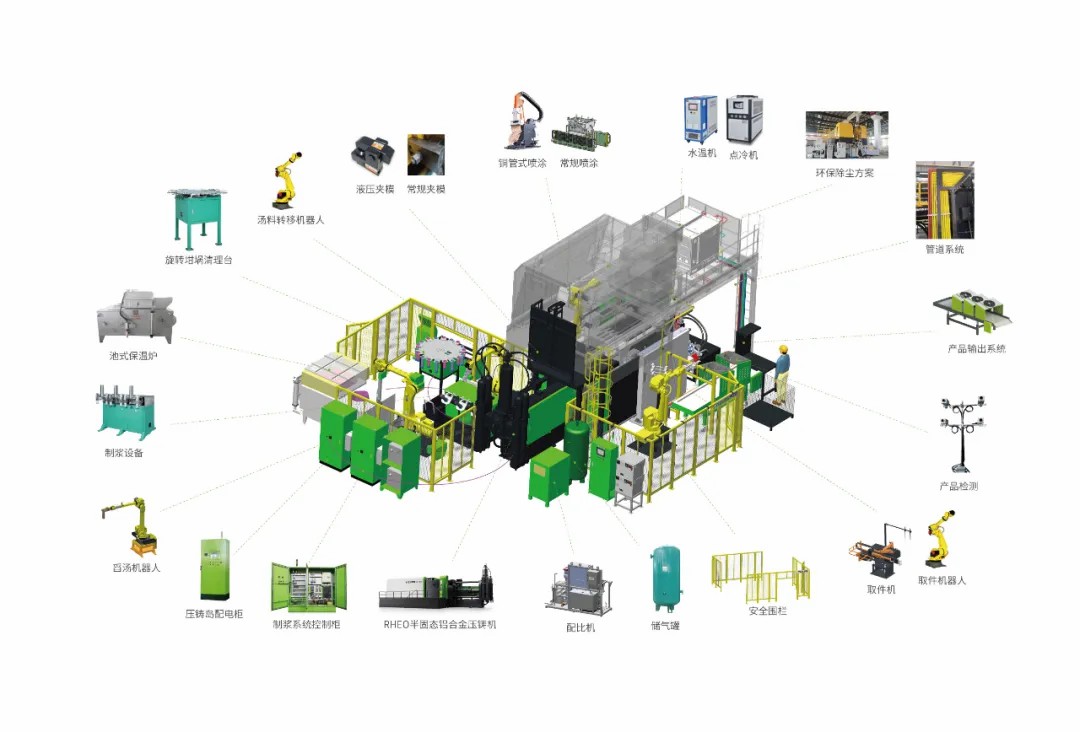 半固態(tài)工藝流程涵蓋熔煉、制備半固態(tài)漿料、低速充型、保壓、冷卻、脫模等環(huán)節(jié),并且需要專用的半固態(tài)成型設備。生產(chǎn)線需要配備漿料制備單元,且對鋁液的溫度和剪切控制要求精確,以確保漿料的質量和穩(wěn)定性。