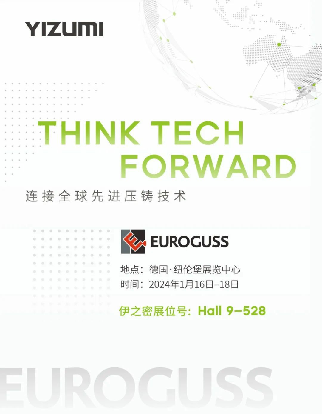 在即將到來的2024年,伊之密將在1月16號(hào)至1月18號(hào),在德國(guó)紐倫堡舉行的歐洲壓鑄工業(yè)展(EUROGUSS 2024)參展,屆時(shí),伊之密將攜LEAP系列530U、高性能熱室壓鑄機(jī)HM90T及先進(jìn)壓鑄技術(shù)亮相展會(huì)。