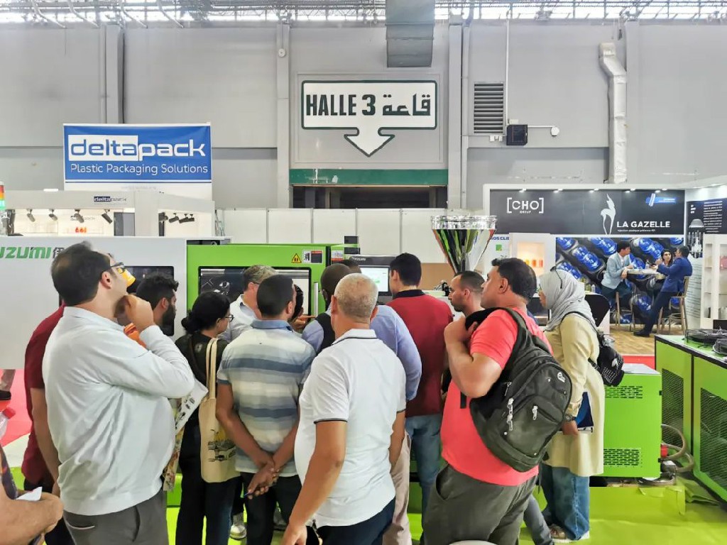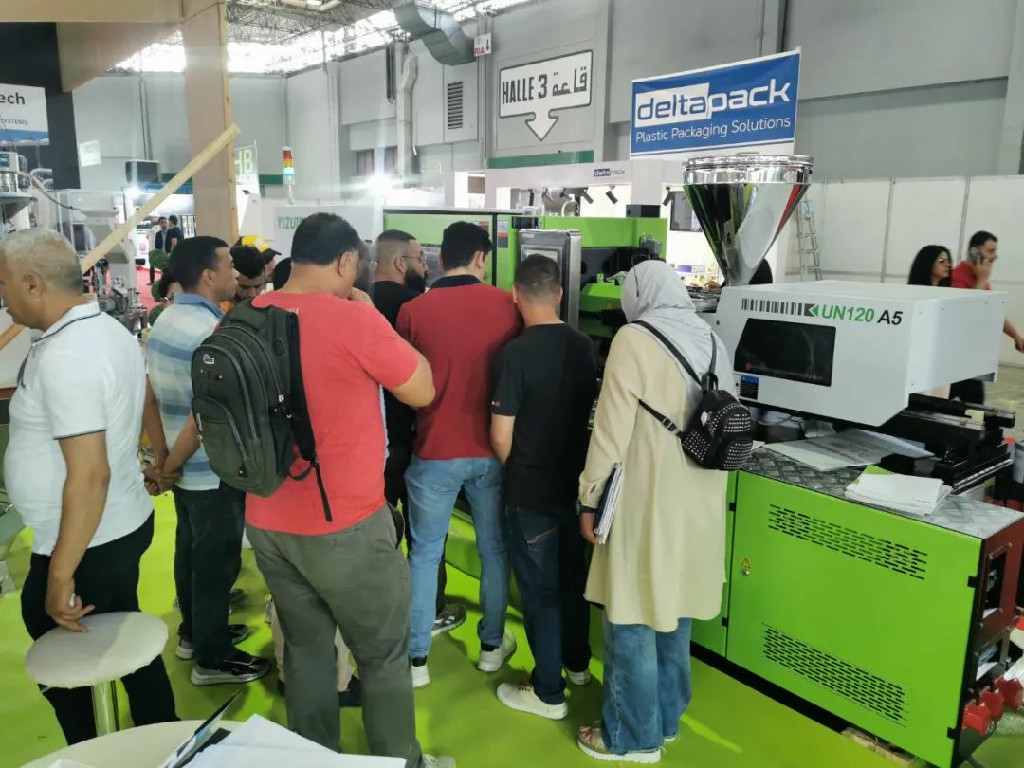 此次突尼斯國際塑料包裝展覽會,伊之密根據(jù)當?shù)氐氖袌鲂枨蠛托袠I(yè)發(fā)展情況,展示伊之密暢銷機型A5系列。現(xiàn)場,眾多商客駐足圍觀,與工作人員深度交流。