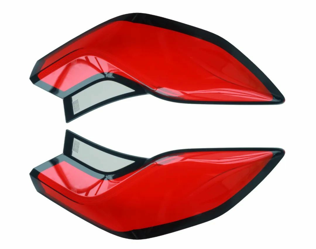 5、多色車燈創(chuàng)新成型應(yīng)用,其中兩個(gè)射臺(tái)直接注射車燈紅色主體部分,另外兩個(gè)射臺(tái)分別注射黑色和透明部分,從而縮短注射時(shí)間,減少流道長(zhǎng)度,提升效率和提高質(zhì)量。