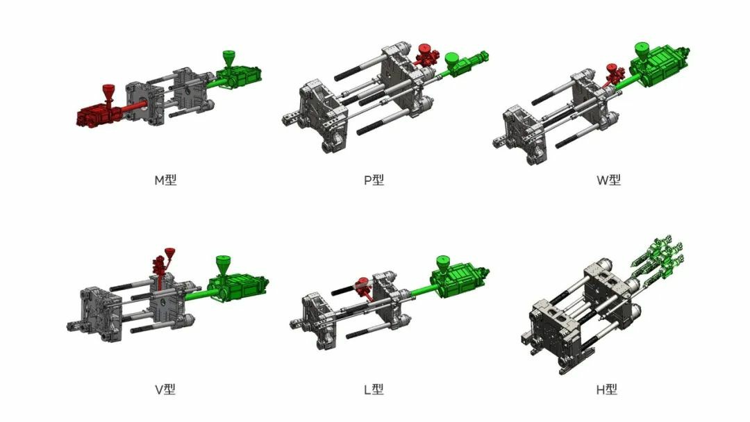 1、模塊化設(shè)計(jì),四個(gè)射臺(tái)呈H型平行四角分布于定模側(cè),結(jié)構(gòu)緊湊,占用空間??;