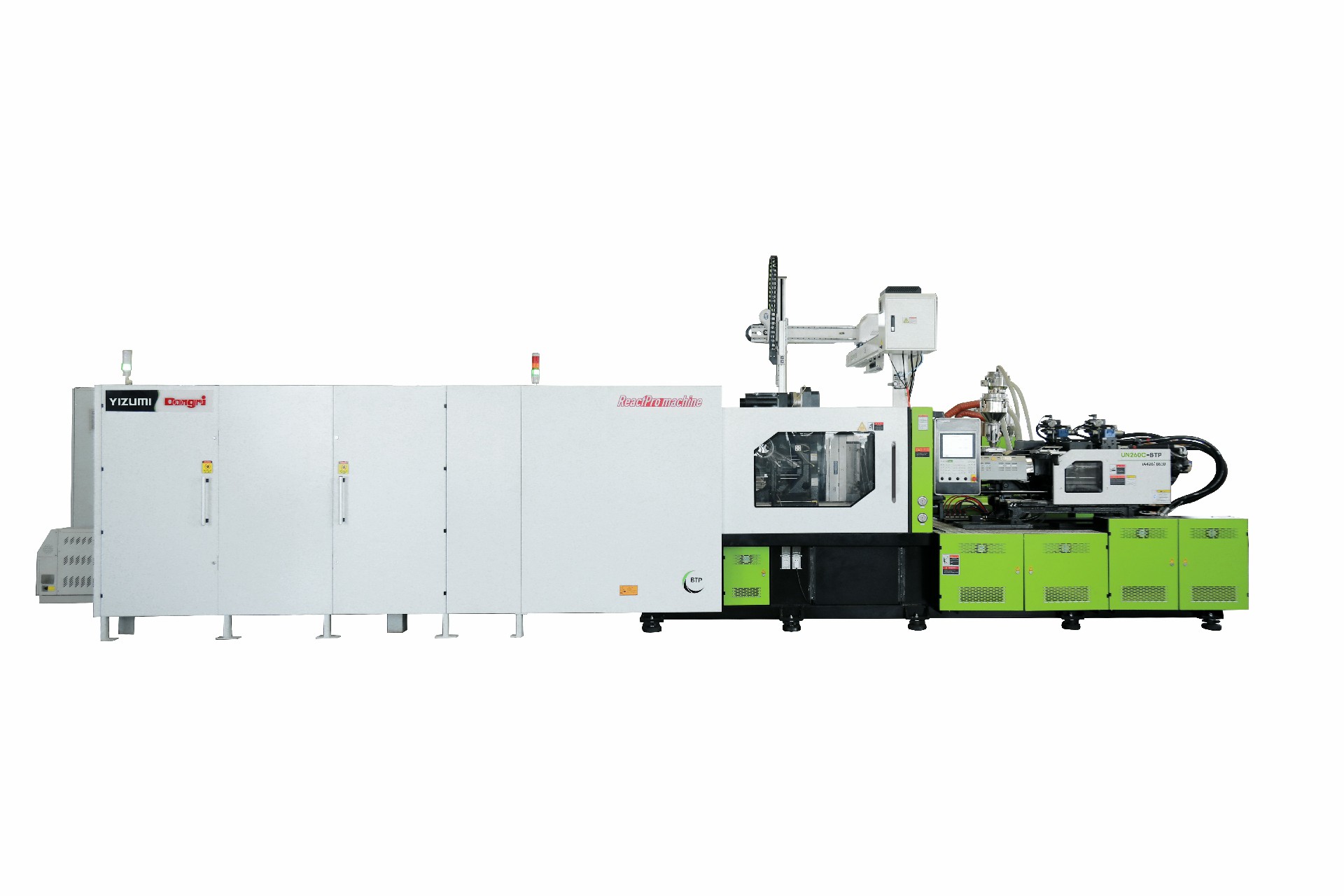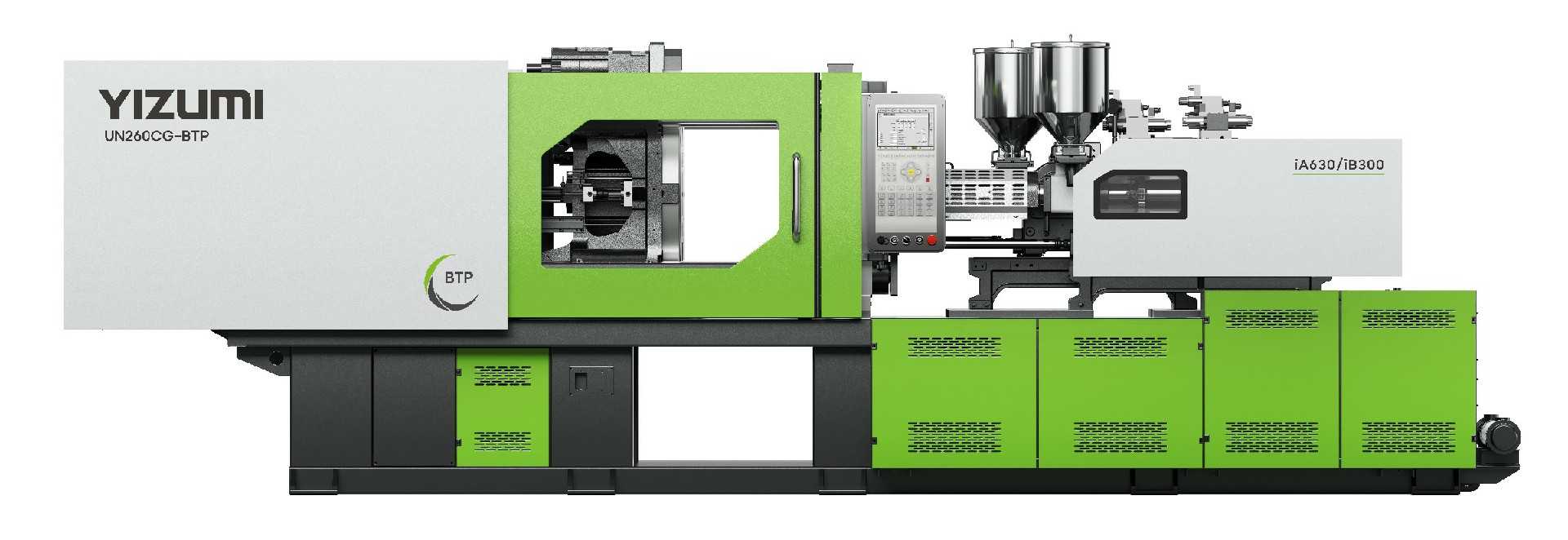 UN280CG-BTP 五加侖雙色水蓋 (20+20) 專用機,機器配備高效防粘塑化系統(tǒng)、第三代電動伺服轉(zhuǎn)盤控制系統(tǒng)、開模同步轉(zhuǎn)盤技術(shù)、綠色塑化技術(shù)、TieBarFree 技術(shù)、開合模線軌導(dǎo)向技術(shù),結(jié)合高速機械手取件,為 1 出 2 的五加雙色水蓋提供長期穩(wěn)定高效低能耗生產(chǎn)的系統(tǒng)性解決方案。