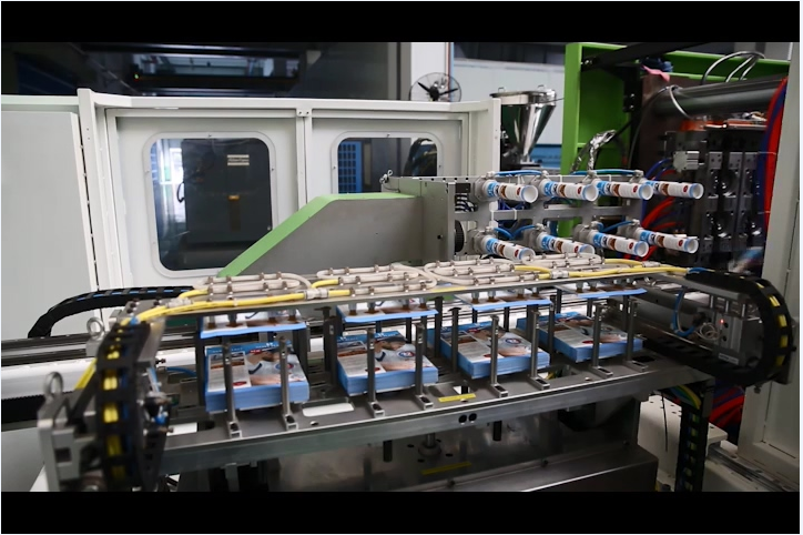 為達到高品質(zhì)的外觀效果,伊之密置高精度貼標機械手,精準取出標紙、送標、穩(wěn)定放置模腔內(nèi),產(chǎn)品成型后開模自由跌落底部輸送帶,不需要取件機械手。