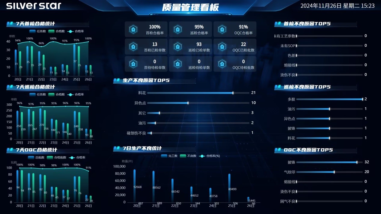 在工廠生產(chǎn)設(shè)備、自動化設(shè)備等硬件部署完成后,銀星通過Yi-MES系統(tǒng)助力生產(chǎn)運營管理體系的建設(shè),以數(shù)字化平臺支持生產(chǎn)運營管理;建立完整的質(zhì)量管理體系,實現(xiàn)質(zhì)量檢測標(biāo)準(zhǔn)化,系統(tǒng)化;建立設(shè)備,模具的數(shù)字化管理體系。