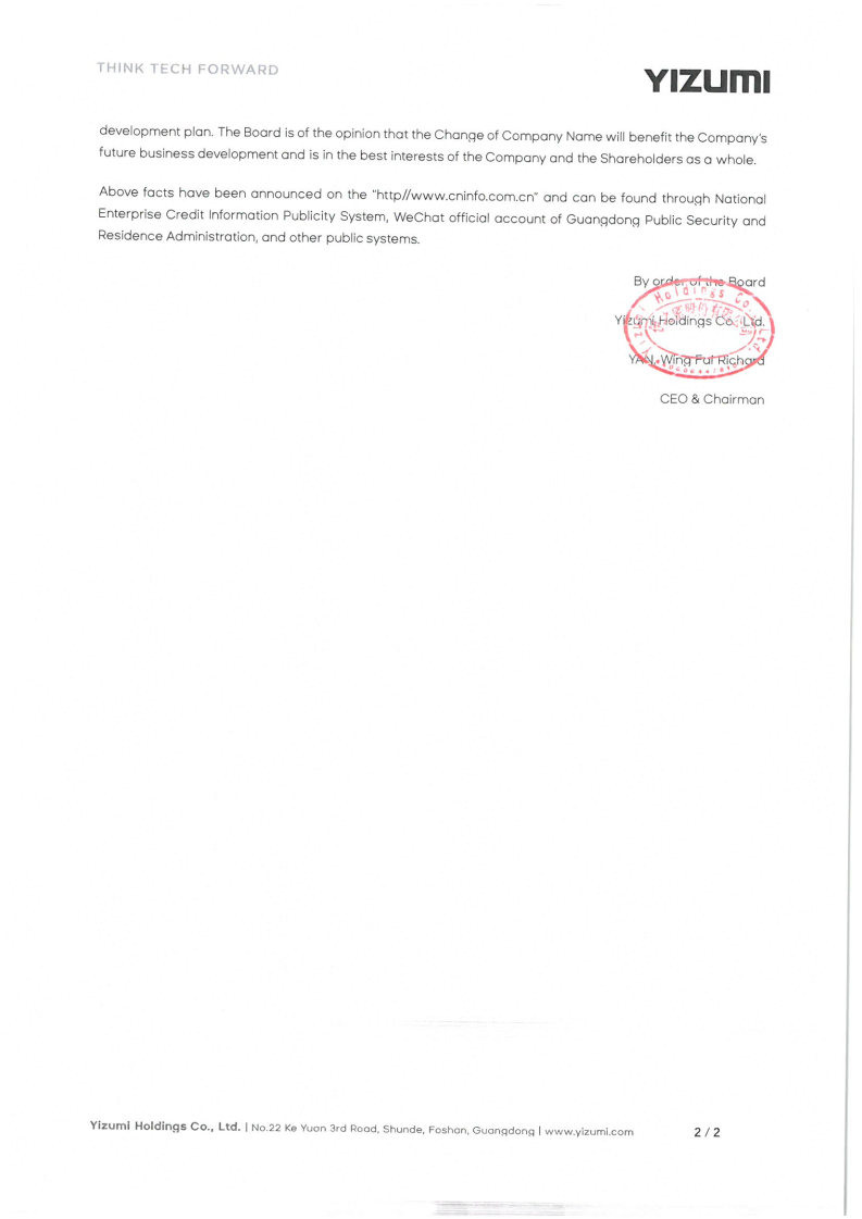 The board of director (the "Board") is pleased to announce that the English and Chinese name of the company have been changed. The English name of the YIZUMI (the "Company") which is changed from "Guangdong Yizumi Precision Machinery Co., Ltd." to "Yizumi Holdings Co., Ltd.", and the Chinese name of the Company which is changed from "廣東伊之密精密機(jī)械股份有限公司" to "伊之密股份有限公司".