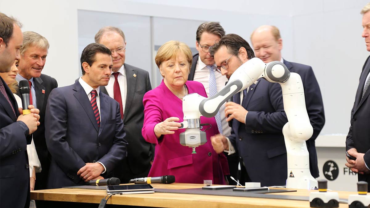 (At the Hannover Messe in Germany in 2018, German Chancellor Angela Merkel and Mexican President Enrique Pe?a Nieto operated co-robot Franka Panda)
