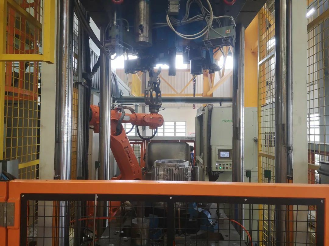 The characteristics of the deep cavity motor housings also pose a challenge to the design of the extractor gripper. Due to the length of the product and the thickness of the mold, the space available for grippers is very limited. If only one gripper was needed to extract the product and place it on the conveyor, the space would be sufficient. However, in addition to the product extraction, this die-casting cell also needs to cut the ingate system and trim the overflows, which requires the extraction robot to be equipped with a dual function (biscuit/part) gripper to extract and place the product in the hydraulic press after ingate cut.