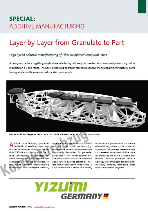 在英文雜志Kunststoffe international的11月刊上,伊之密機(jī)器人柔性增材制造系統(tǒng) SPACE A也上了頭條—— “德國伊之密正在準(zhǔn)備向市場推出一種將螺桿式塑化裝置固定在六軸機(jī)器人上的混合式制造單元。這一新式的加工方法實(shí)現(xiàn)了用顆粒和標(biāo)準(zhǔn)纖維增強(qiáng)混合物進(jìn)行結(jié)構(gòu)件的增材制造。”