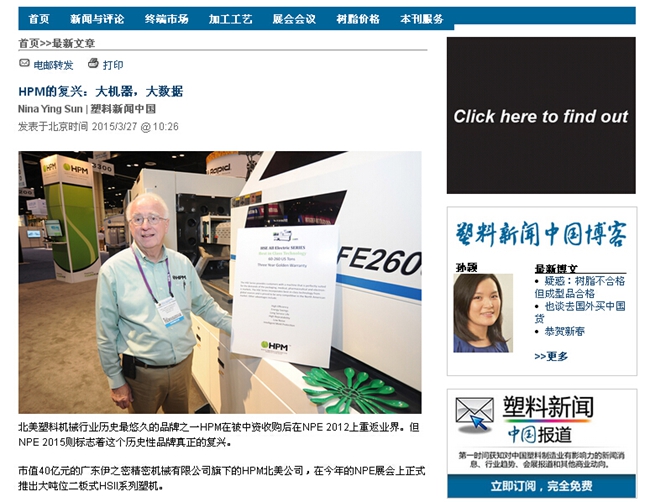 全球橡塑界著名核心刊物《Plastics News》(《塑料新聞》)對(duì)HPM的表現(xiàn)進(jìn)行了報(bào)道,認(rèn)為 “NPE2015標(biāo)志著這個(gè)歷史性品牌真正的復(fù)興”,而且這次復(fù)興的突破在于“大機(jī)器”和“大數(shù)據(jù)”。