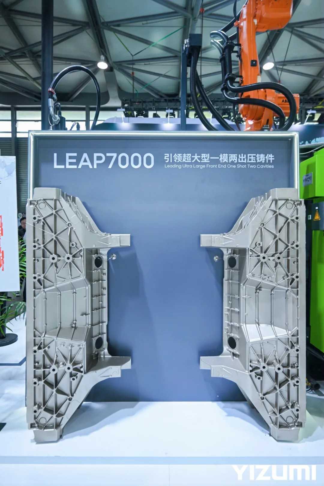 在此次上海壓鑄展上,伊之密展出了多款制品。其中,一模兩出前艙尤為引人注目。該產(chǎn)品的尺寸為700 x380 x1510毫米,單個(gè)重量為34.5公斤,是由LEAP7000超大型壓鑄機(jī)壓射而成。該設(shè)備采用了創(chuàng)新性的模具澆口設(shè)計(jì),使得生產(chǎn)節(jié)拍能夠控制在130秒以內(nèi),顯著提升了生產(chǎn)效率。此外,其精確的壓射控制能力確保了左右兩件搭接面尺寸偏差控制在±0.5mm以內(nèi),尺寸合格率達(dá)到98%以上,充分驗(yàn)證了LEAP 系列壓鑄機(jī)完全有能力滿足新能源汽車大型一體化壓鑄結(jié)構(gòu)件極為苛刻的需求。