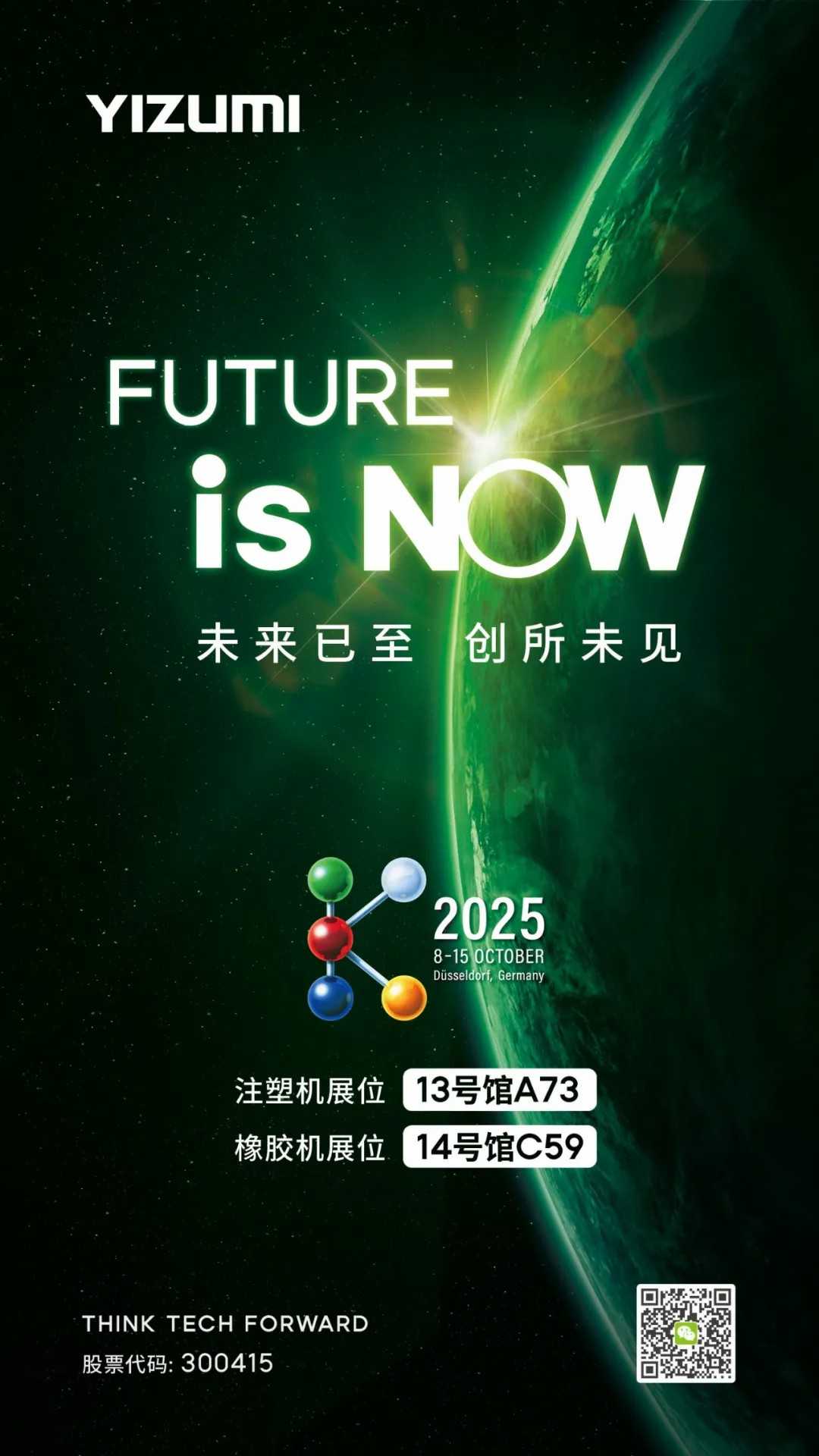 伊之密,作為中國(guó)模壓成型裝備制造業(yè)的領(lǐng)軍企業(yè),始終以技術(shù)創(chuàng)新為核心驅(qū)動(dòng)力,不斷詮釋“塑料的力量”。此次參展,伊之密以“Future is Now”為主題,彰顯了其對(duì)未來(lái)發(fā)展的堅(jiān)定信心與前瞻視野。